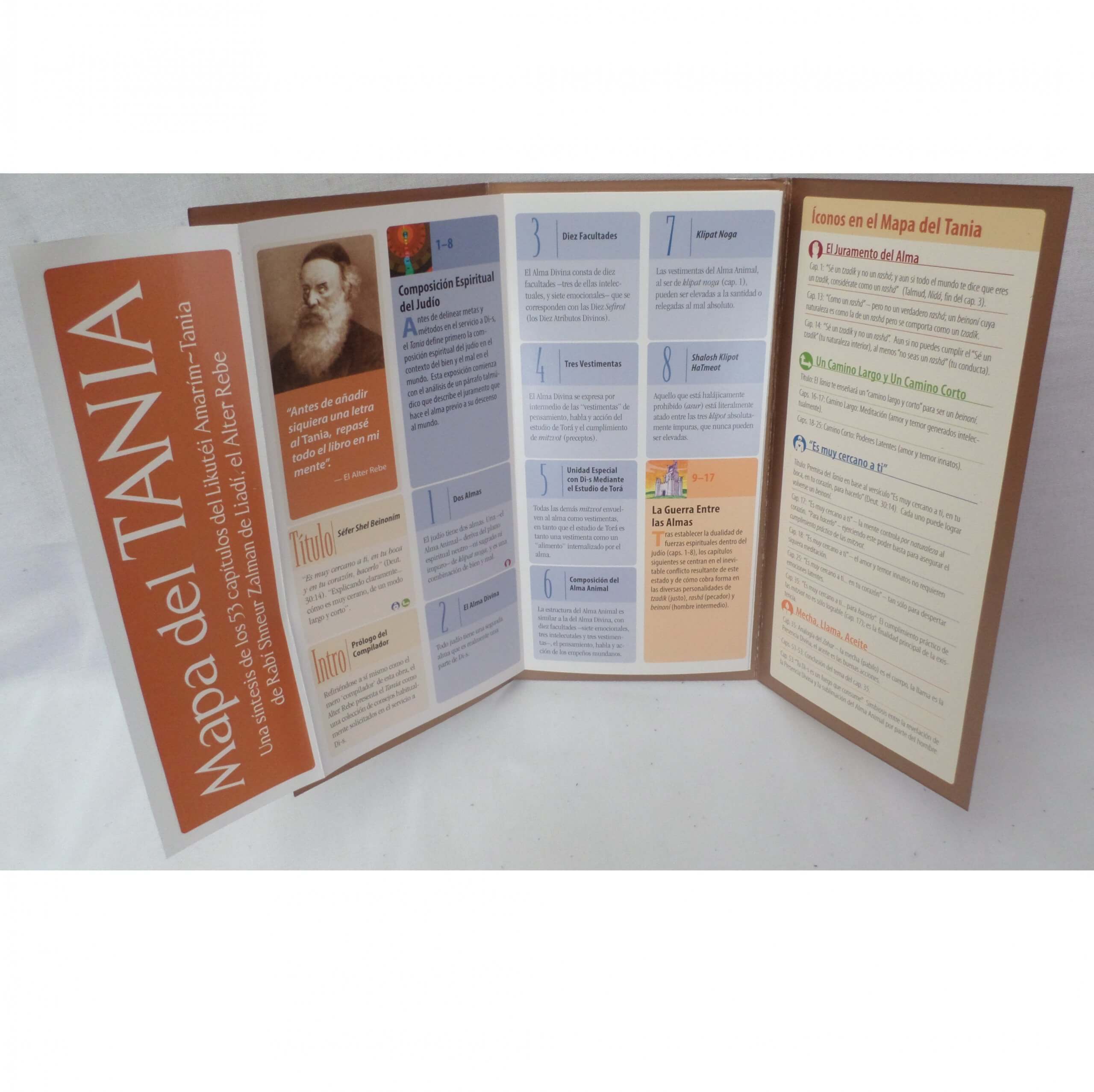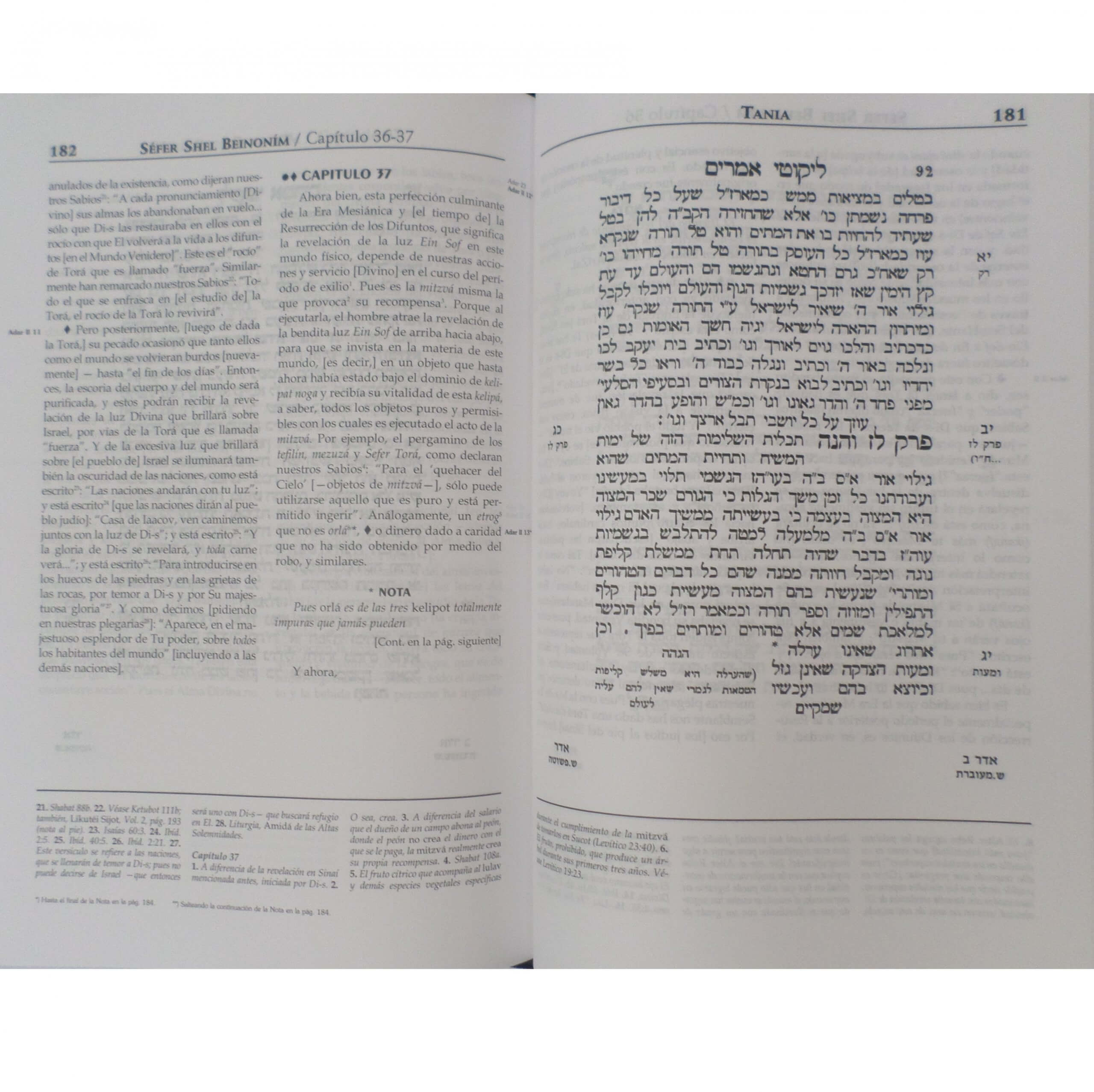 El Tania es una exposición filósofico-cabalística que enseña al hombre a aproximarse a su Creador. Toda la obra, con el texto castellano y hebreo frente a frente, página a página, facilitando su lectura. ¿Qué somos? ¿Cómo somos? ¿Cómo estamos formados? Y sobre todo, ¿qué venimos a hacer a este mundo? ¿Dónde nos encontramos física, mental, espiritual y sentimentalmente? ¿Cómo podemos relacionarnos con el mundo exterior de la mejor manera posible para tener una vida armoniosa, para que nuestras acciones sean positivas y para que todo ello esté en concordancia con la finalidad de la creación de los mundos? Ofrece también un índice Temático (del Rebe) en español, y el aclamado “Conceptos Mìsticos en el Jasidismo”, del Rabino Schochet. Viene con el Mapa del Tania (síntesis de cada capítulo) de regalo!