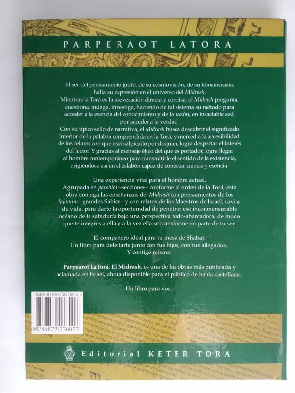 Agrupa en Parashiot conforme al orden de la Tora, conjuga las enseñanzas del Midrash con pensamientos de los Jajamim y con relatos de los Maestros de Israel, savias de vida.